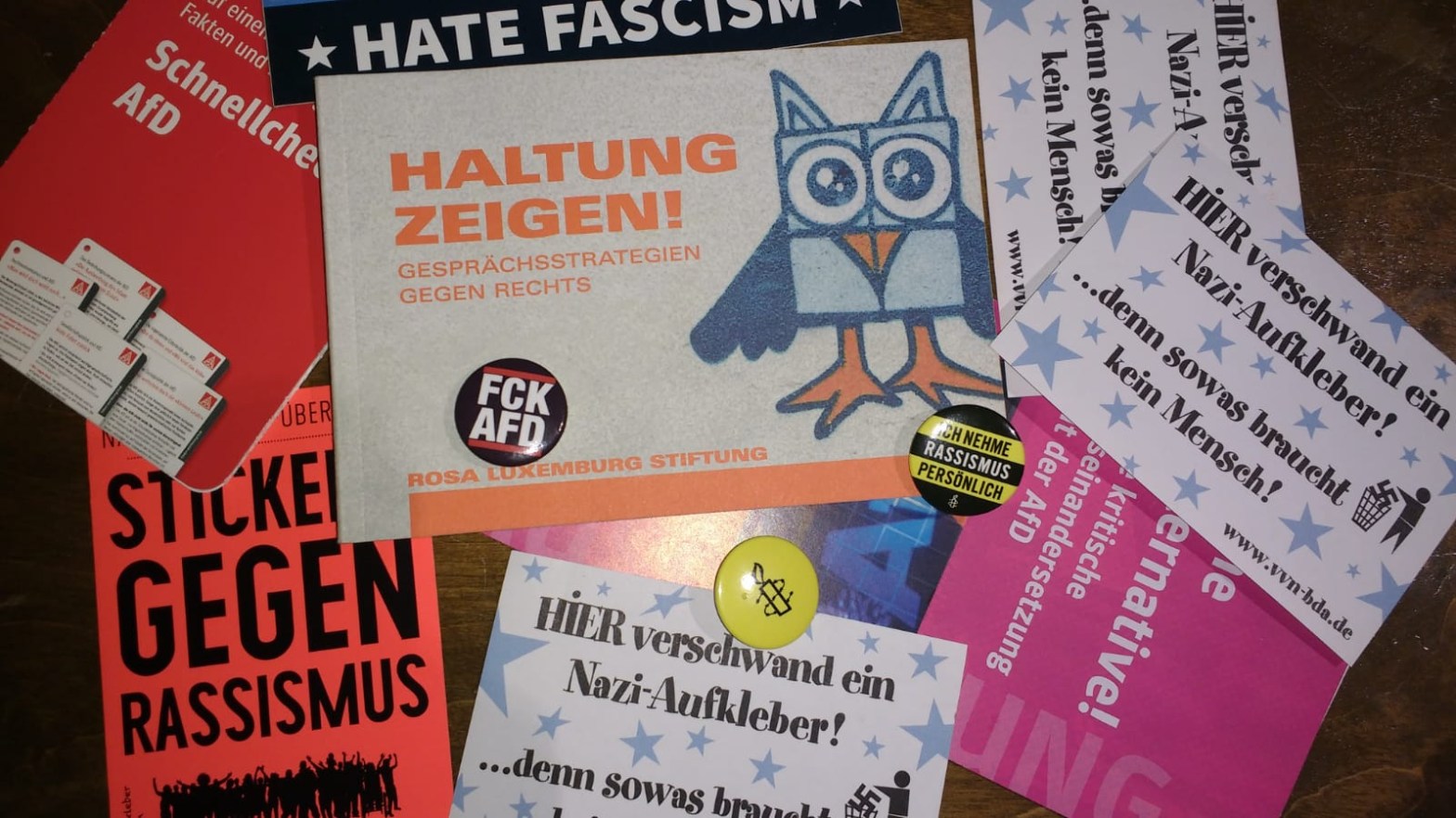 Il materiale è tratto da “Haltung Zeigen! Gesprächsstrategien gegen Rechts“ la cui copertina illustra un gufo sì, ma che prima era una svastica. A Berlino il progetto #PaintBack-Aktion ritrasforma simboli dell’estrema destra in cose decisamente più piacevoli alla vista.