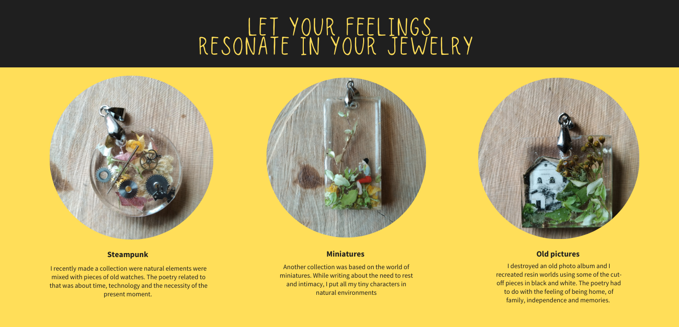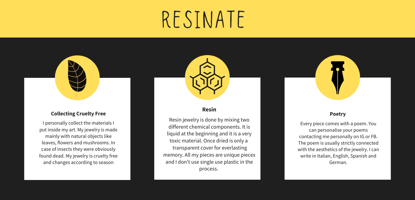 Il materiale trasparente è resina bicomponente, si tratta di due sostanze liquide che dopo alcune ore solidificano venendo a contatto. Il resto del materiale è prevalentemente upcycling, naturale (funghi, foglie vere) e nel caso degli insetti ci tengo a specificare che raccolgo cruelty free, ovvero non catturo animali vivi ma li trovo già morti. Inoltre nel processo ho da poco eliminato la plastica monouso, quindi produco nella maniera più etica che mi è venuta in mente ( ma sono sempre aperta a suggerimenti!). Ogni pezzo è unico come la poesia che vi abbino e punto molto di più all’originalità che alla perfezione tecnica, producendo tutto sul balcone di casa mia. Spedisco in tutto il mondo, con metodo tracking per garantire la vostra e la mia sicurezza e personalizzo come e quanto volete per rendere il pezzo, già unico, qualcosa di ancora più “vostro”